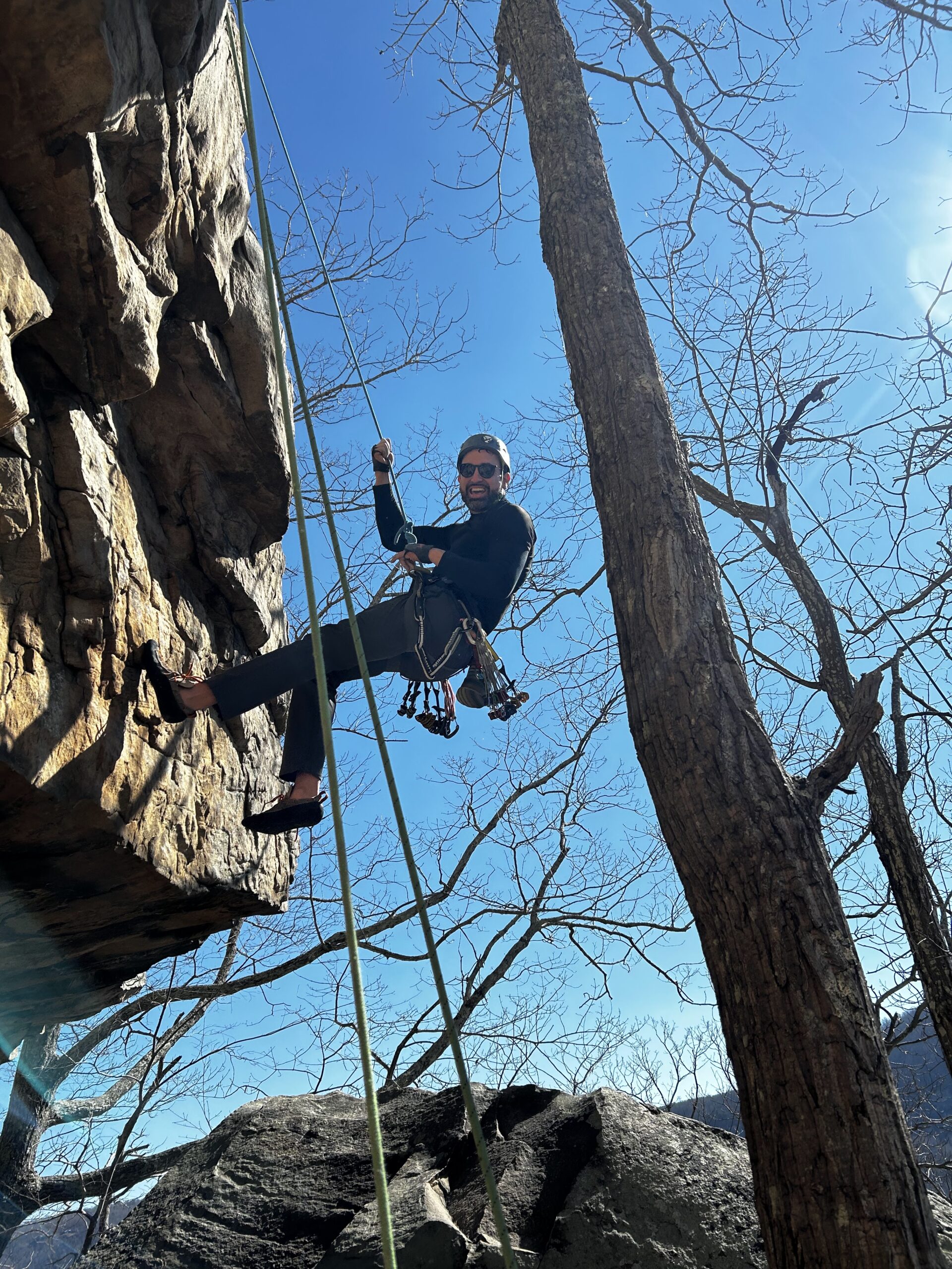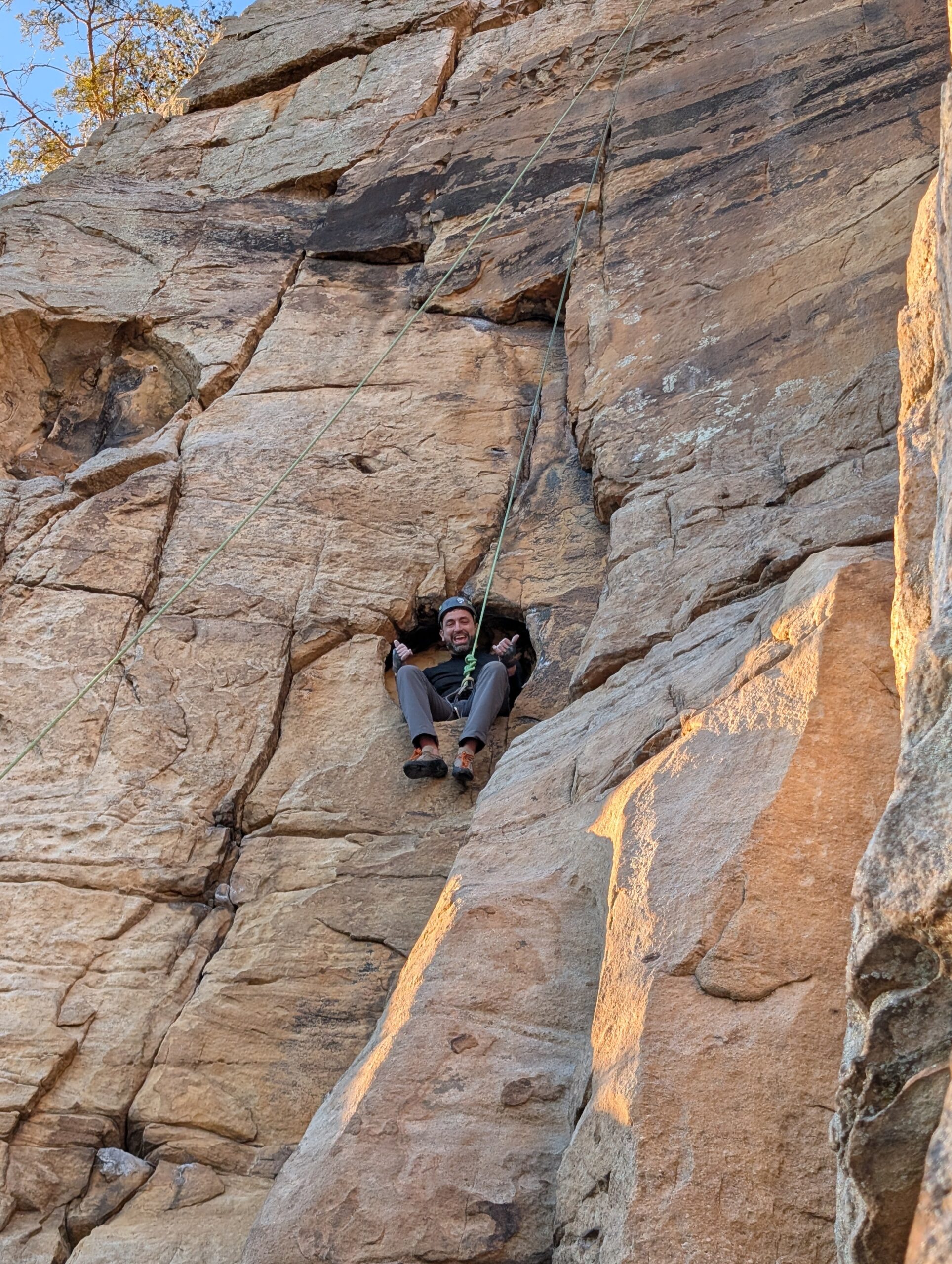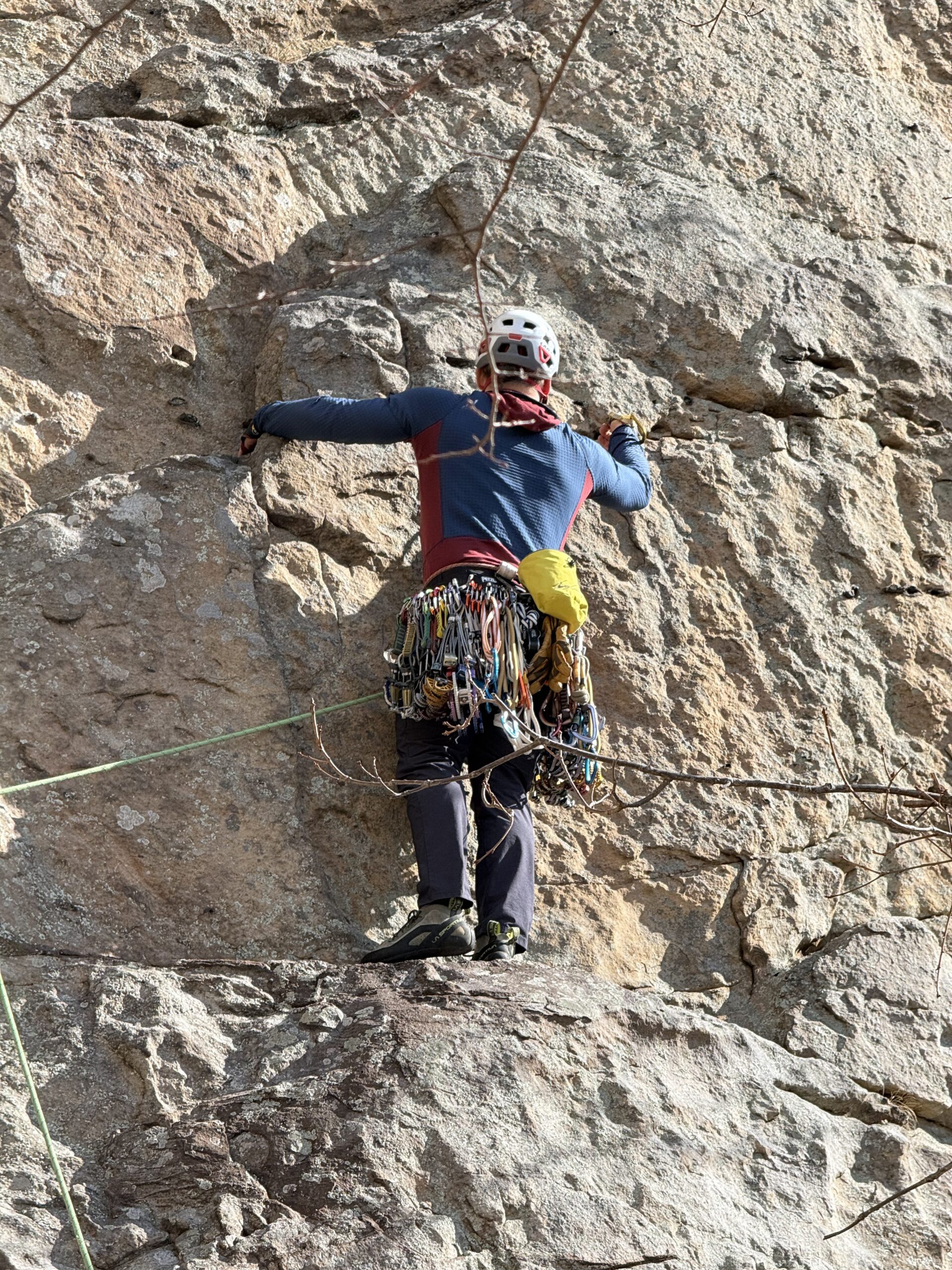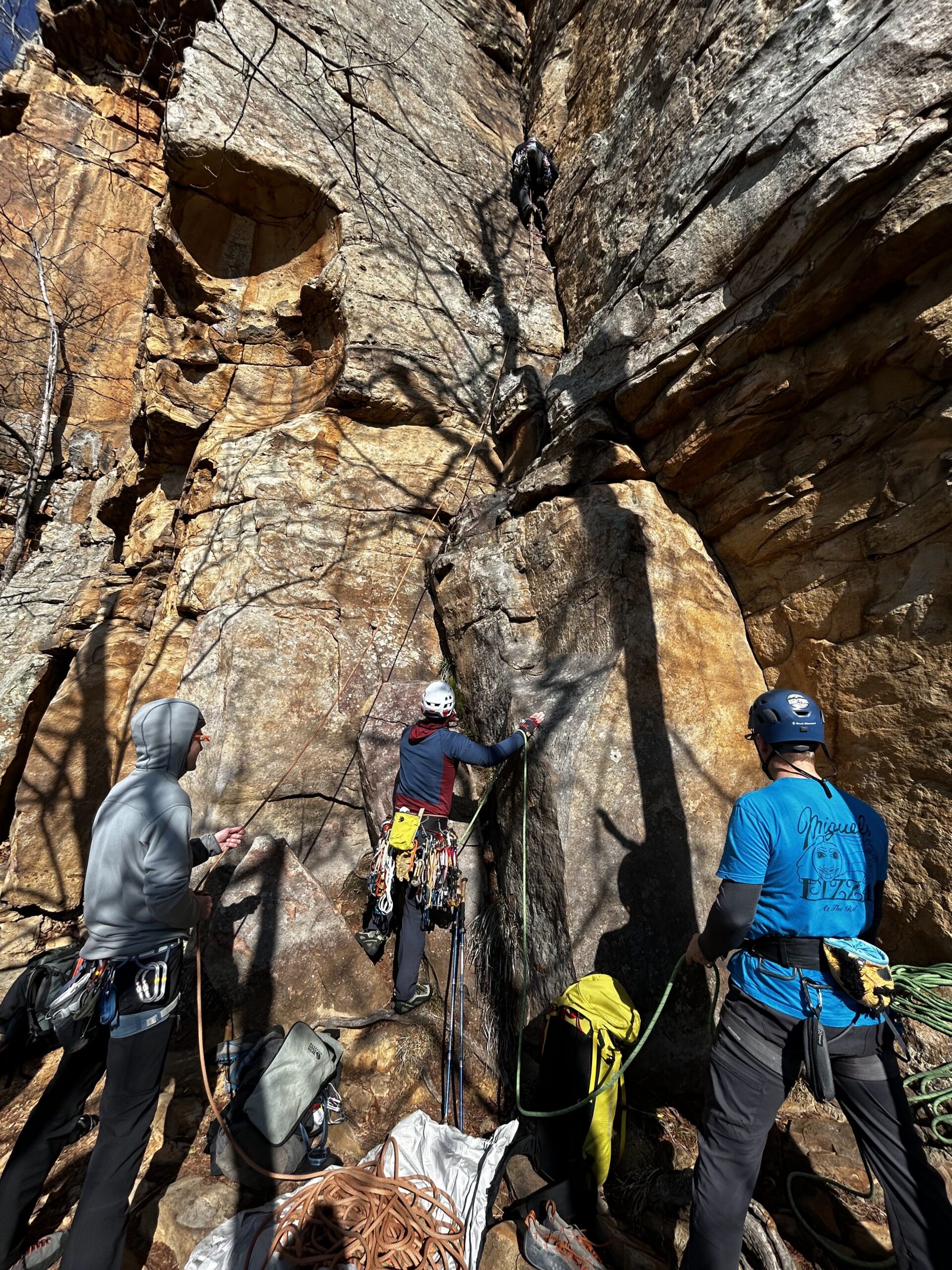 Weather was perfect for the club’s trip to T-Wall on 2/7. We had a good showing, there were about 15 of us who showed up to climb. Our venerable trad leaders worked their way up routes including New Beginnings 5.5, Plastic Toys 5.7, Nappy 5.7, Art 5.8, Prerequisite for Excellence 5.8 and a few others. The group took turns top roping and cleaning the routes. For a couple members of the group, it was their first time getting on a rope outside! We wrapped up the trip with burgers at River Drifters where the Send Chain was awarded to Billy Matarazzo for his most challenging trad onsight yet of Prerequisite for Excellence.